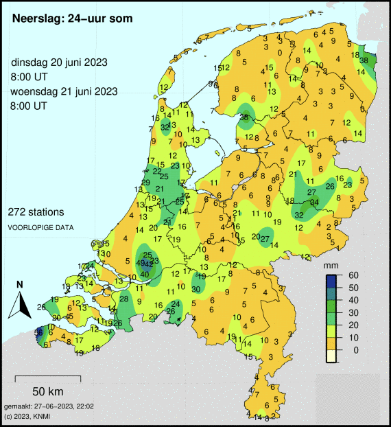 a) De registratieperiode loopt van 8 – 8 UTC. De dagwaarde van 23 juni heeft daarom vooral betrekking op de neerslag die is gevallen op 22 juni, de dag ervoor.