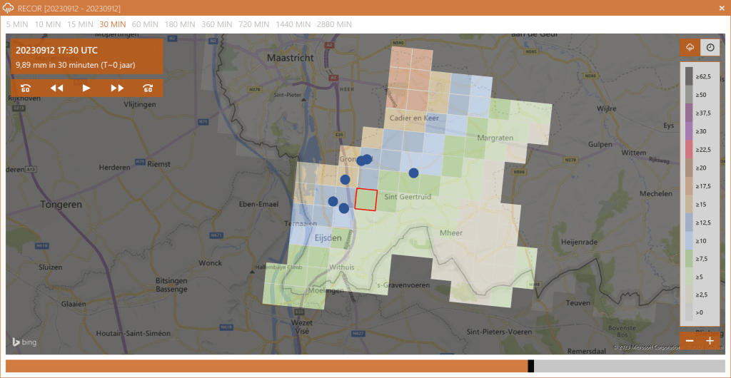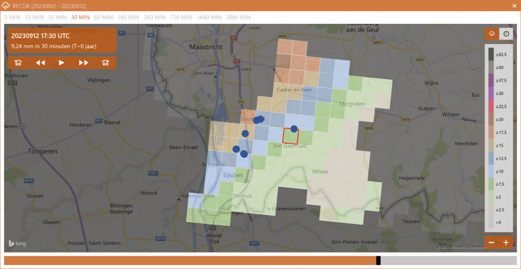 Locaties meldingen wateroverlast gemeente Eijsden-Margraten op 12 september 2023, in samenhang met (RFcor) radarneerslag voor het interval van 30 minutenLocaties meldingen wateroverlast gemeente Eijsden-Margraten op 12 september 2023, in samenhang met (REcor) radarneerslag voor het interval van 30 minuten