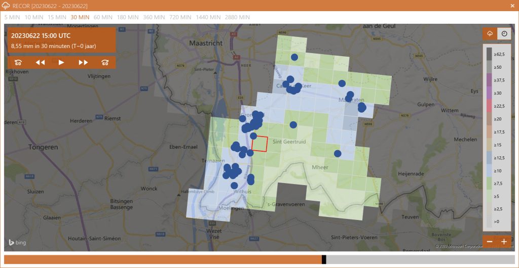 22 juni 2023 Maximum neerslag gedurende 30 minuten, MFBS en REcor