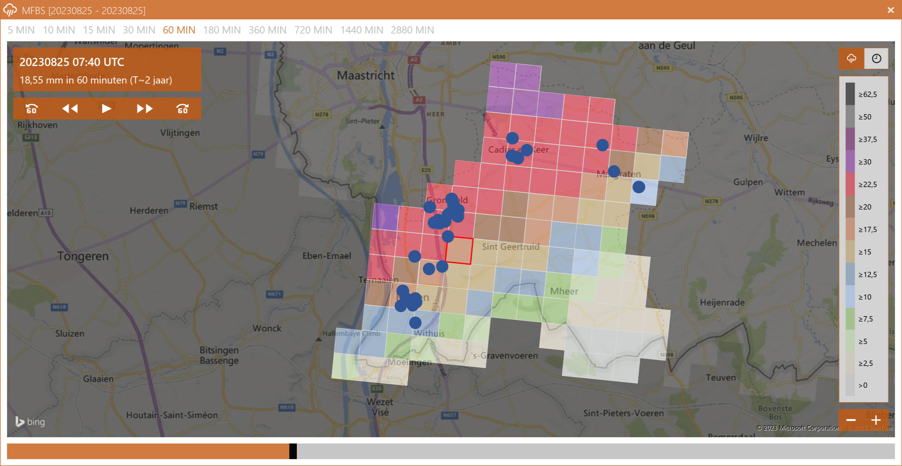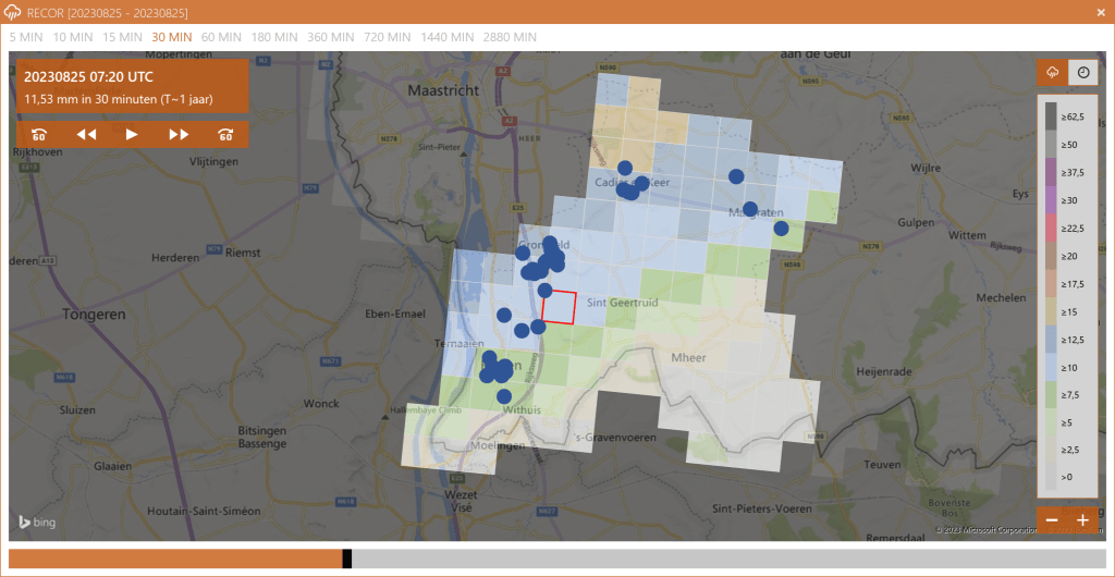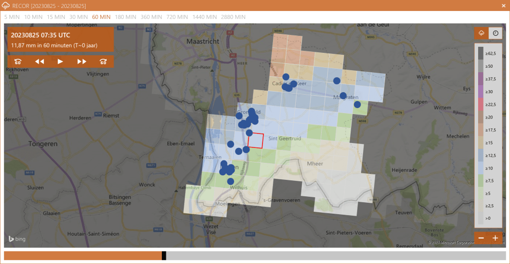 Locaties meldingen wateroverlast gemeente Eijsden-Margraten op 25 augustus 2023, in samenhang met (MFBS) radarneerslag voor het interval van 60 minutenLocaties meldingen wateroverlast gemeente Eijsden-Margraten op 25 augustus 2023, in samenhang met (REcor) radarneerslag voor het interval van 60 minuten