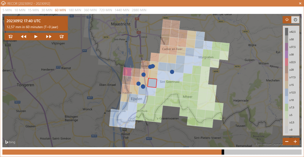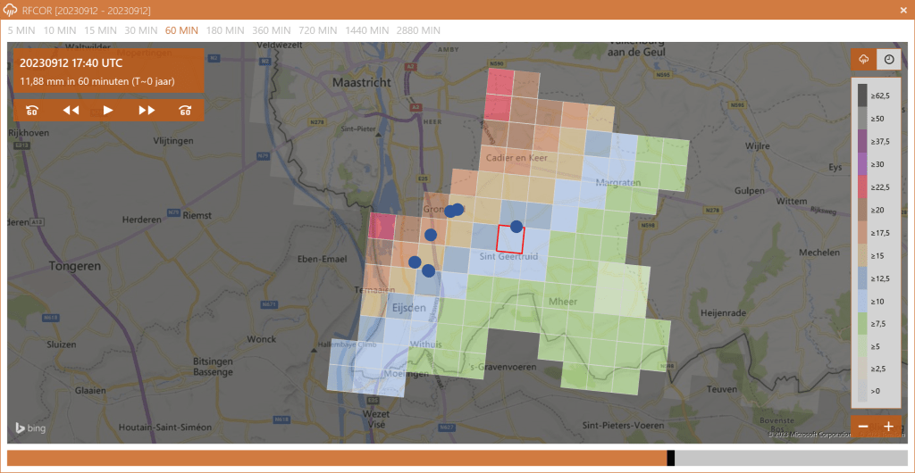 Locaties meldingen wateroverlast gemeente Eijsden-Margraten op 12 september 2023, in samenhang met (RFcor) radarneerslag voor het interval van 60 minutenLocaties meldingen wateroverlast gemeente Eijsden-Margraten op 12 september 2023, in samenhang met (REcor) radarneerslag voor het interval van 60 minuten
