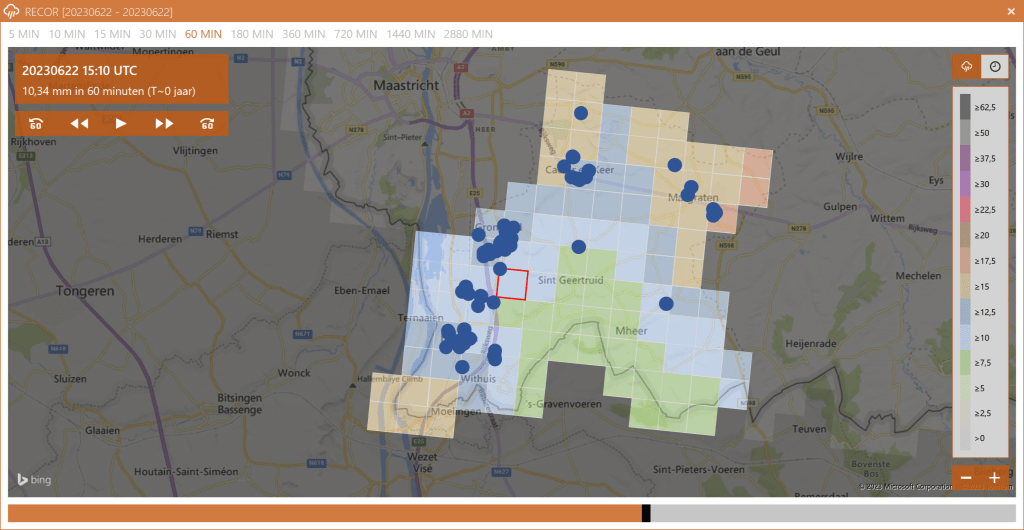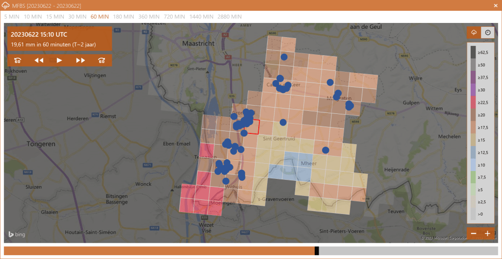 Locaties meldingen wateroverlast gemeente Eijsden-Margraten op 22 juni 2023, in samenhang met (MFBS) radarneerslag voor het interval van 60 minuten.Locaties meldingen wateroverlast gemeente Eijsden-Margraten op 22 juni 2023, in samenhang met (REcor) radarneerslag voor het interval van 60 minuten