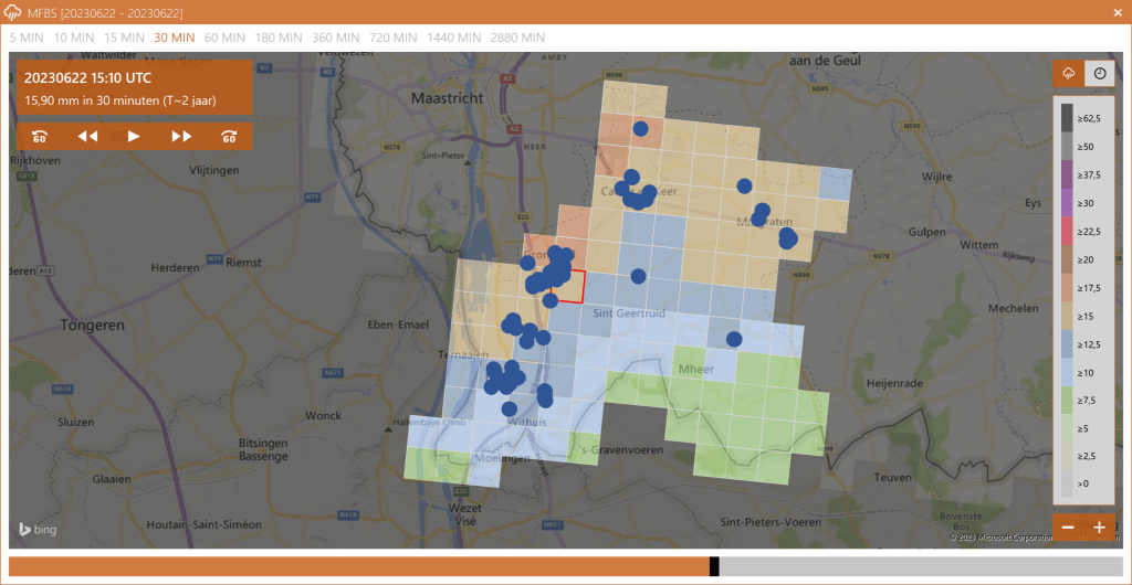 Locaties meldingen wateroverlast gemeente Eijsden-Margraten op 22 juni 2023, in samenhang met (MFBS) radarneerslag voor het interval van 30 minuten.Locaties meldingen wateroverlast gemeente Eijsden-Margraten op 22 juni 2023, in samenhang met (REcor) radarneerslag voor het interval van 30 minuten.