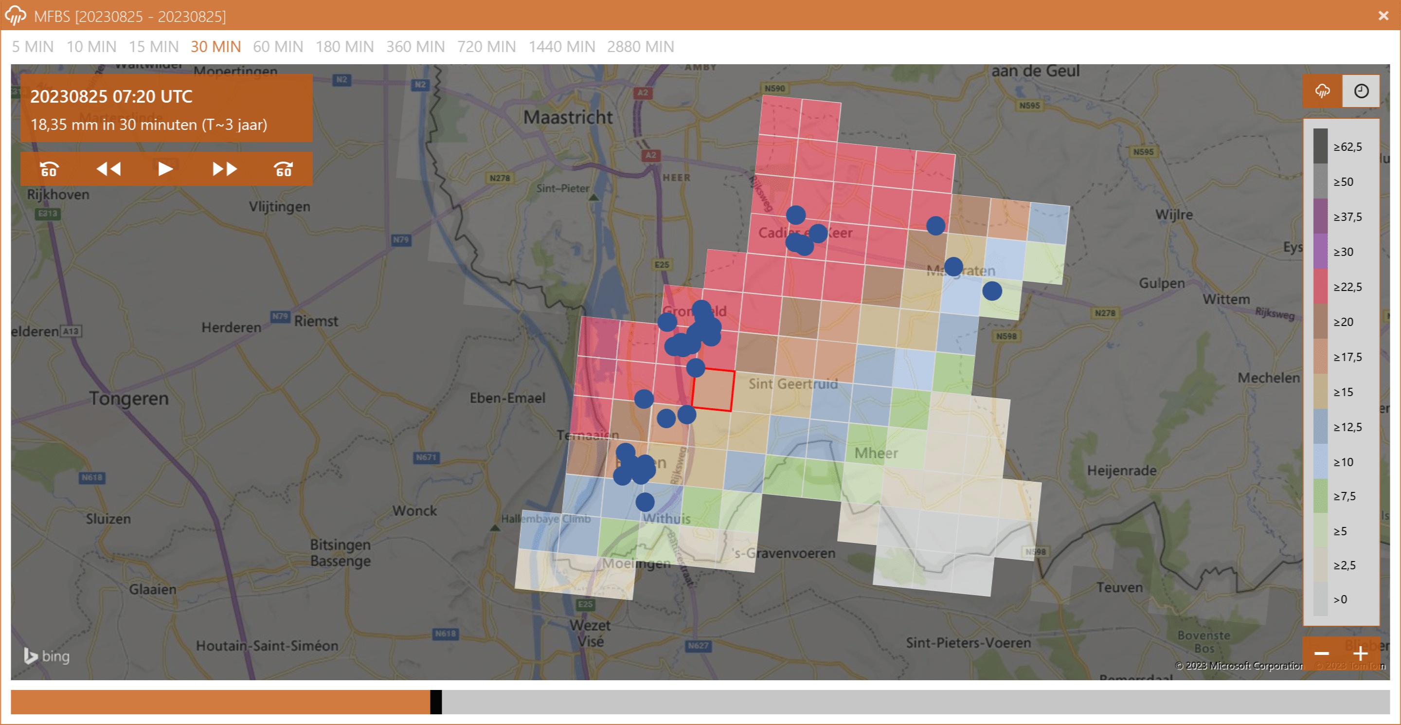 Locaties meldingen wateroverlast gemeente Eijsden-Margraten op 25 augustus 2023, in samenhang met (MFBS) radarneerslag voor het interval van 30 minuten.Locaties meldingen wateroverlast gemeente Eijsden-Margraten op 25 augustus 2023, in samenhang met (REcor) radarneerslag voor het interval van 30 minuten.